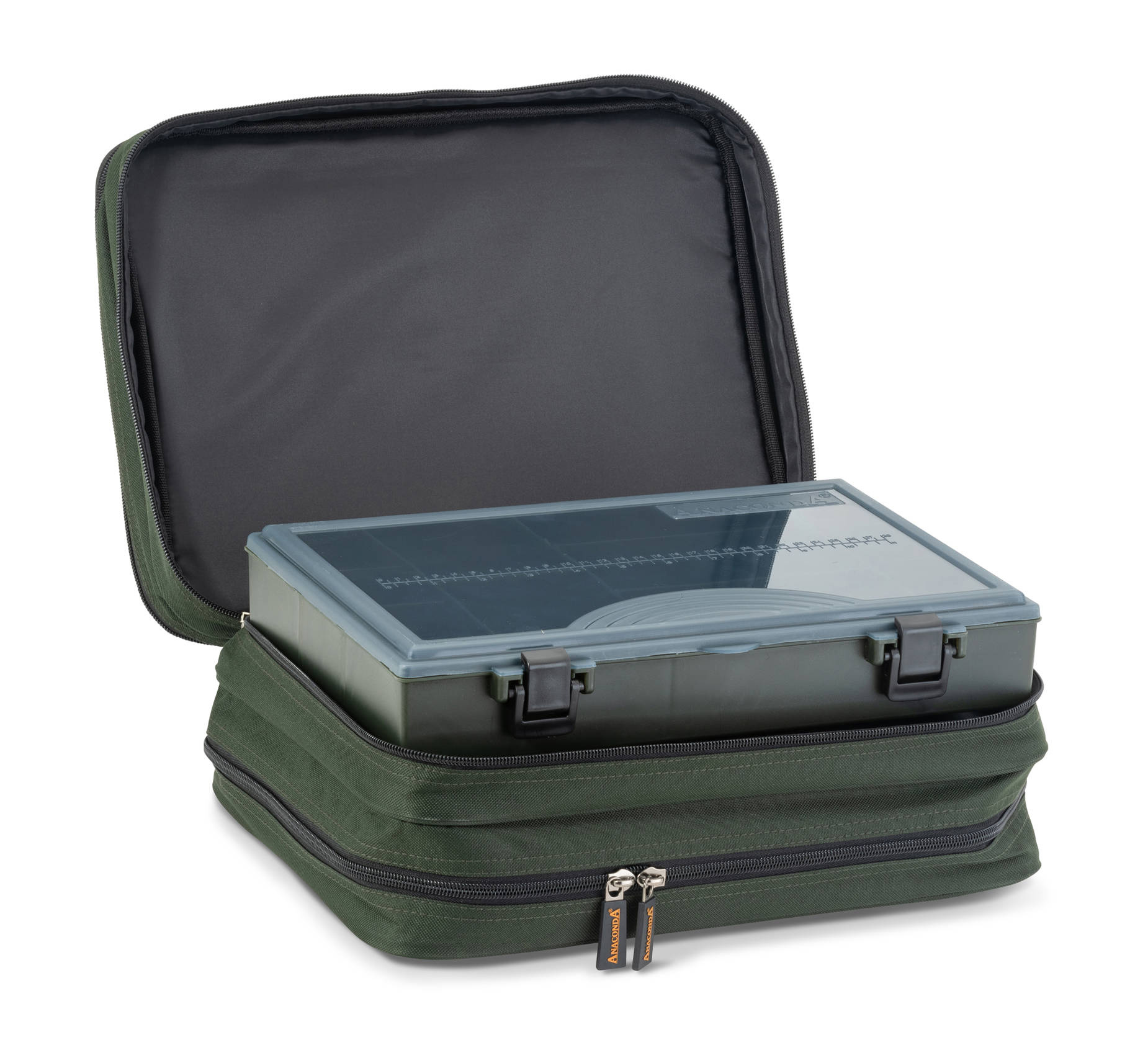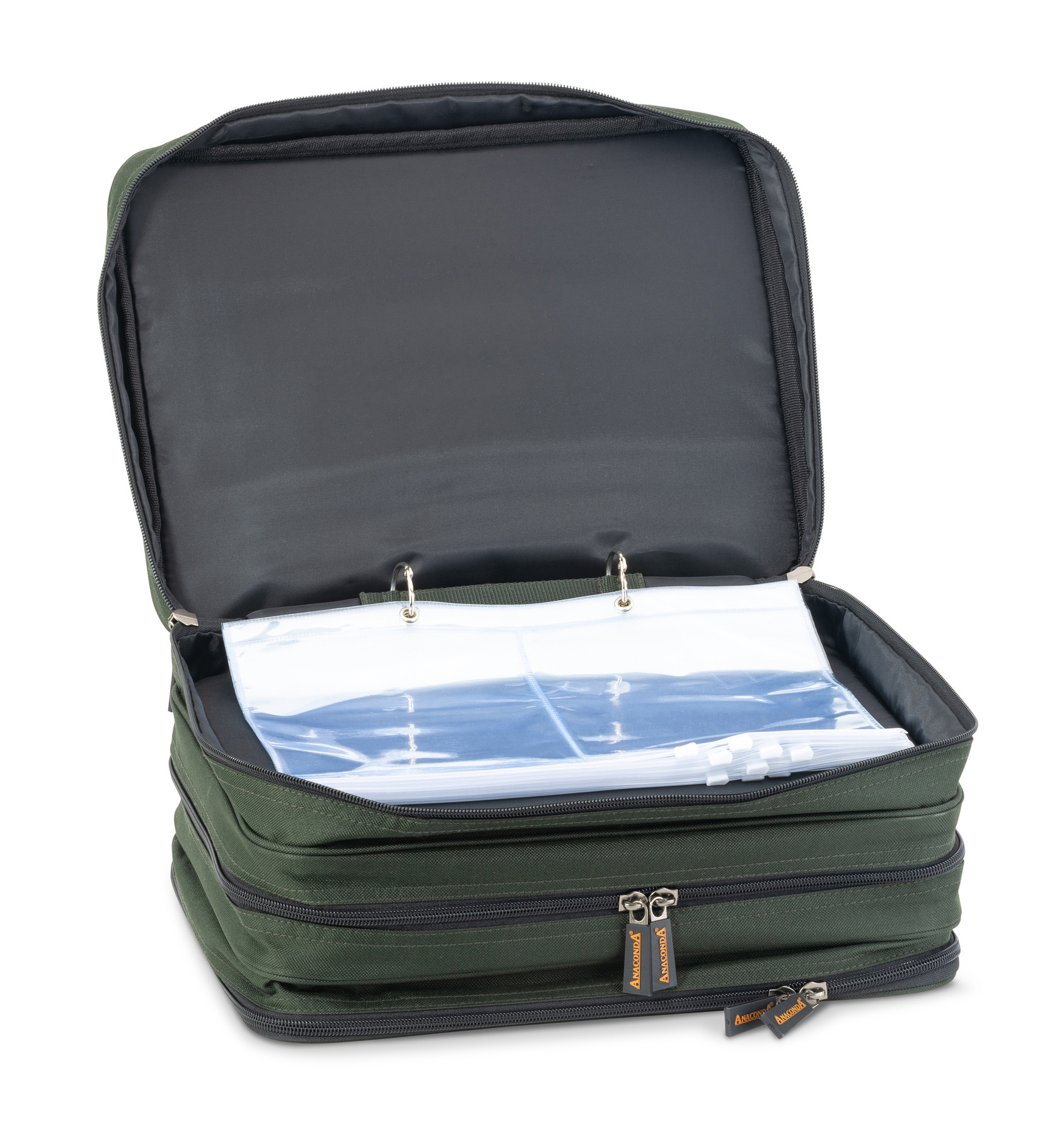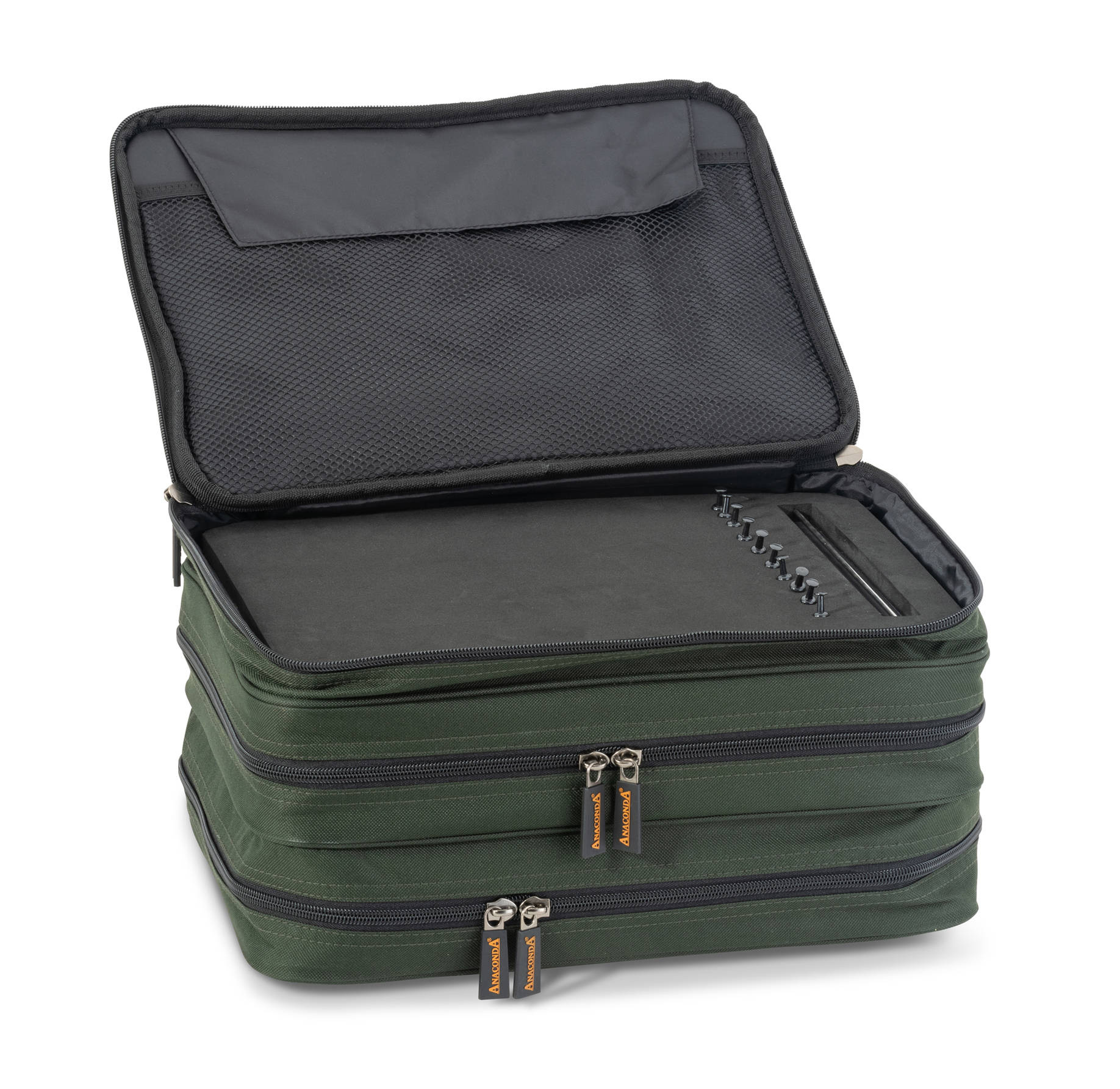 W pierwszej z trzech kieszeni znajduje się duża tablica Rig Board z tworzywa EVA z dołączonymi 10 szpilkami, w drugiej duży organizer Tackle Box (Tackle Chest L) do porządkowania małych akcesoriów, a w trzeciej - 10 przezroczystych koszulek do przechowywania w formacie A4 zamykanych na suwak.