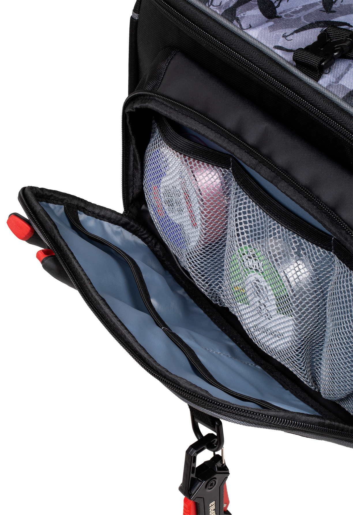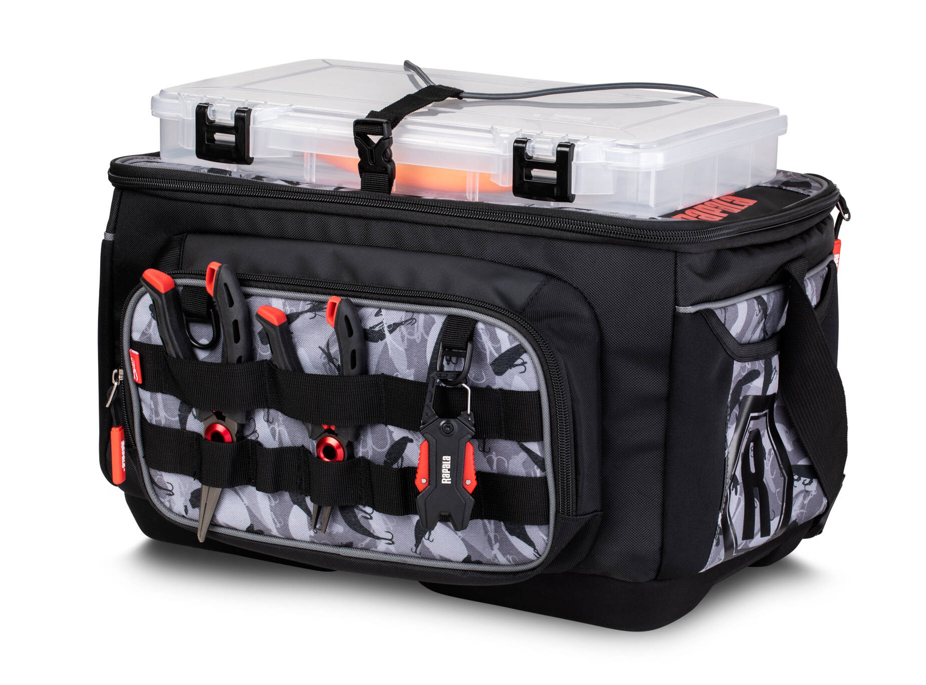 Wnętrze torby zostało tak zaprojektowane, aby pomieścić cztery pudełka na przynęty Rapala 356, z dodatkową piątą umieszczoną na górze, zapewniającą szybki dostęp do ulubionych wabików.
