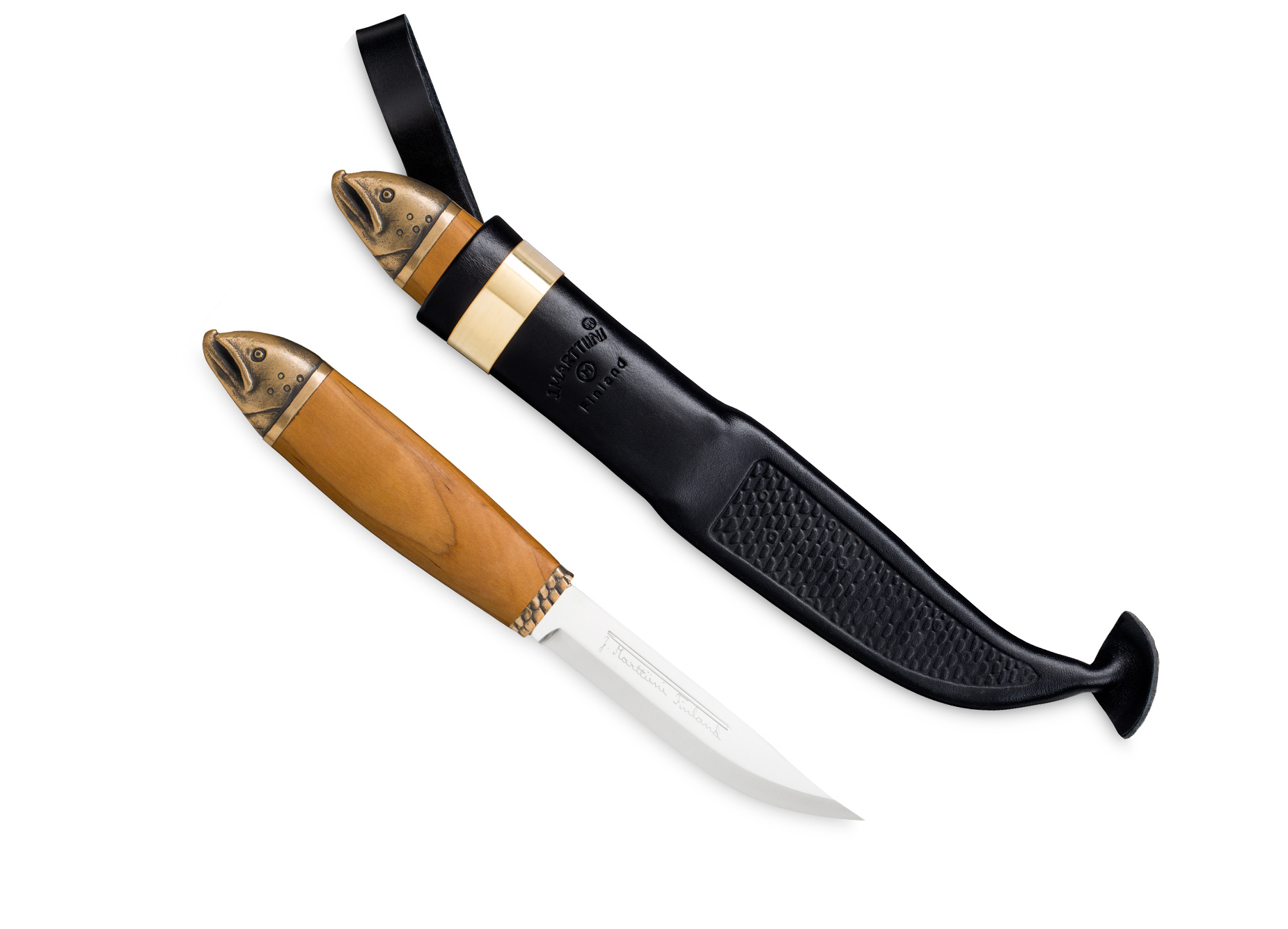 Rękojeść z termicznie stabilizowanej brzozy karelskiej została starannie wyprofilowana, co gwarantuje pewny chwyt nawet w wilgotnych warunkach.