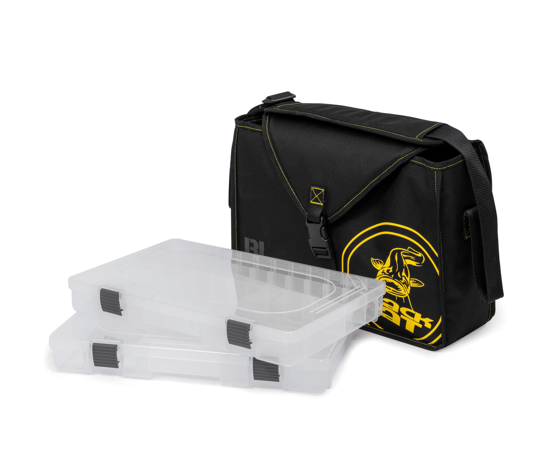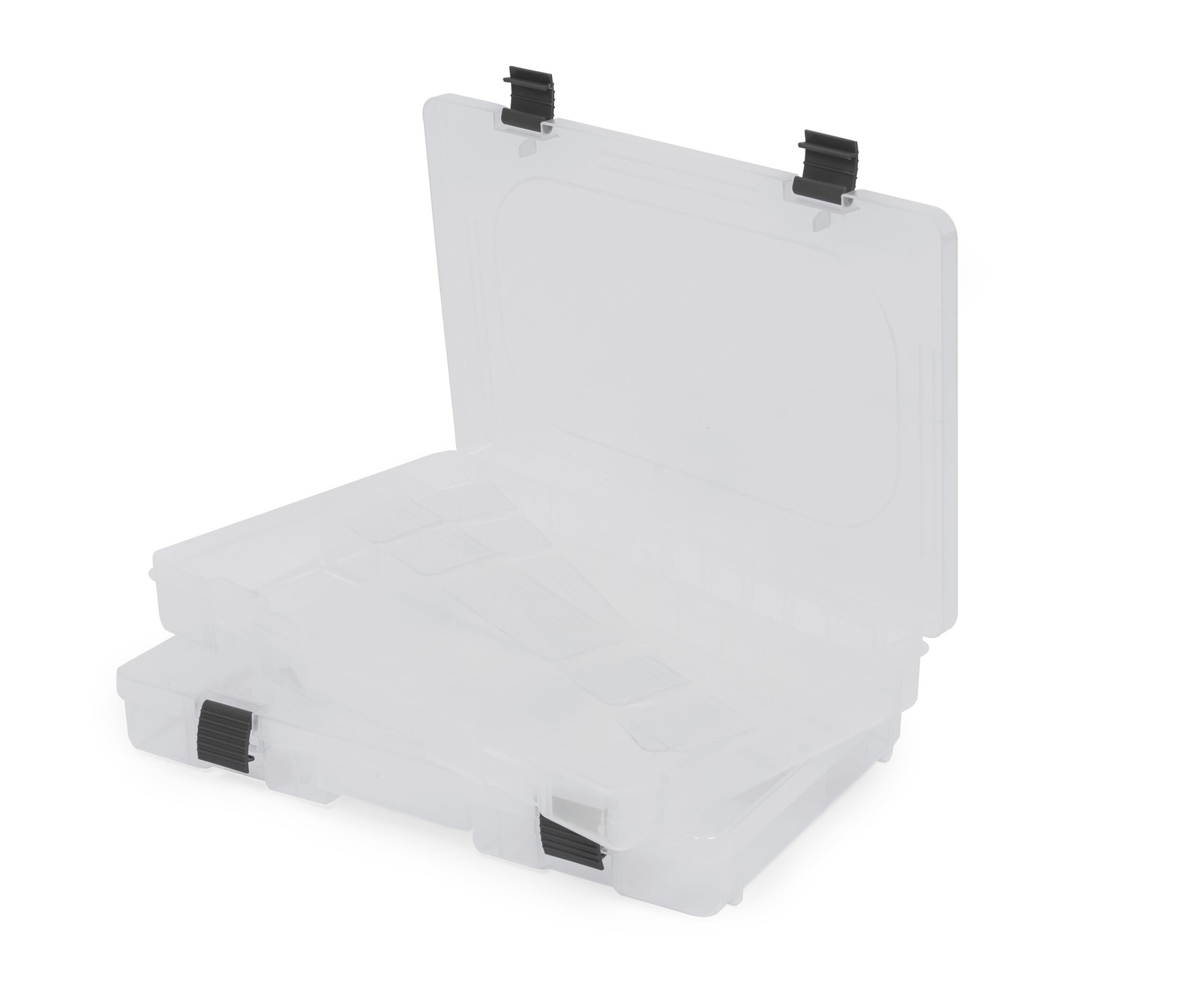 Dwa pojemne pudełka na przynęty i akcesoria (36 × 22,5 × 4,5 cm), idealne na wahadłówki, woblery, gumy czy główki jigowe.