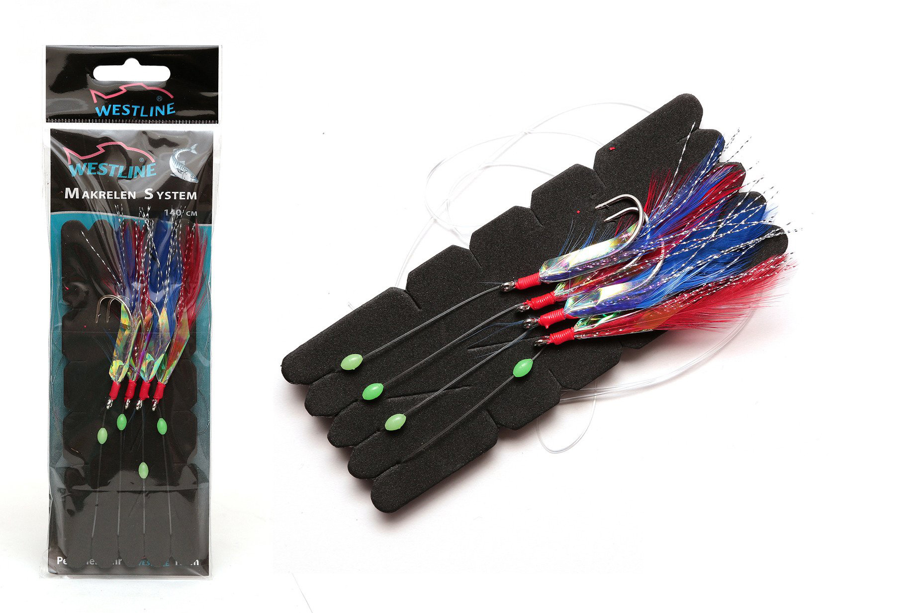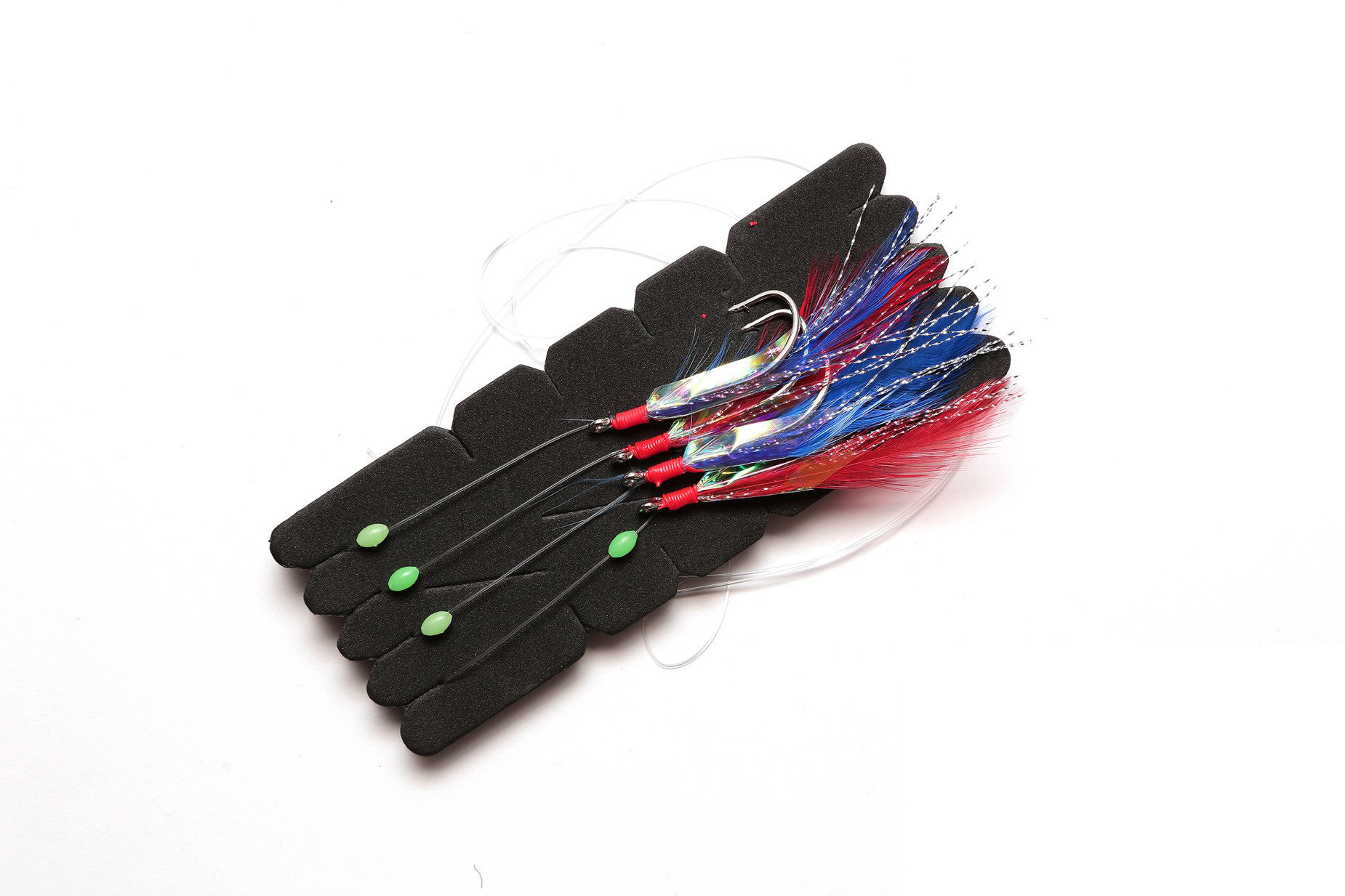 Przypon na makrele z 4 haczykami O‘Shaughnessy, imitacją rybiej skóry i piórami.
